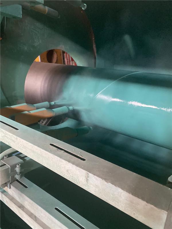 開始生產時,先用試驗管在生產線上分別依次調節預熱溫度及膠粘劑防腐層的厚度,聚乙烯層的包覆采用側向纏繞工藝,應確保搭接部分的聚乙烯完全輥壓密實,并防止壓傷聚乙烯層表面,膠粘劑的涂敷采用側向纏繞工藝,且涂敷必須在環氧粉末膠化過程中進行,以確保膠粘劑與環氧涂料能相互滲透,使其達到各項要求后方可開始生產。